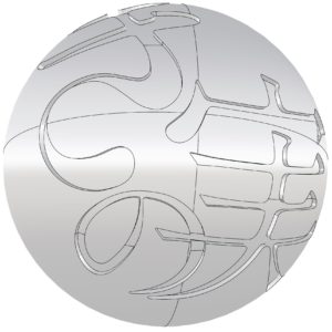 最終的には透明度の高い80mm~200mmぐらいのアクリル球に最新の切削設備:5軸加工機による3次元彫込み加工を行い、白いインクを流し込みます。透明なので反対側からも文字が見えます。これ、実は普通のサイン屋さんではできないものなんです。かといって切削機械を扱うメーカーさんもロゴデザインやデータ制作から入れないので、それだけに希少性が有り、インパクトがあるはずです。