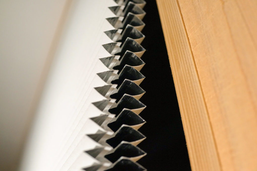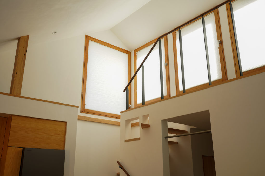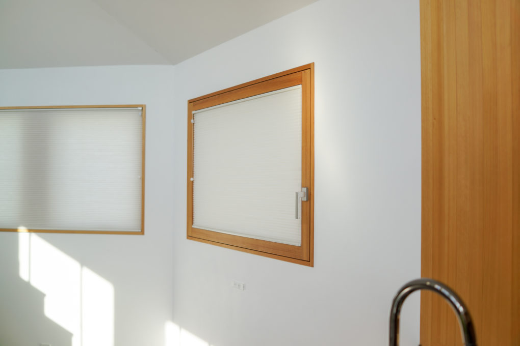 「素敬の家」では窓全てに、ハニカム・サーモスクリーンを組み合わせました。開口部の断熱性能を更に高めることができ、性能が比較的低いサッシでも、最新の窓に肉薄するような性能へと向上させることが可能です。ハニカムとはその名の通り、ポリエステル不織布を蜂の巣状に構成し、空気の複層によって断熱性が上がるわけです。